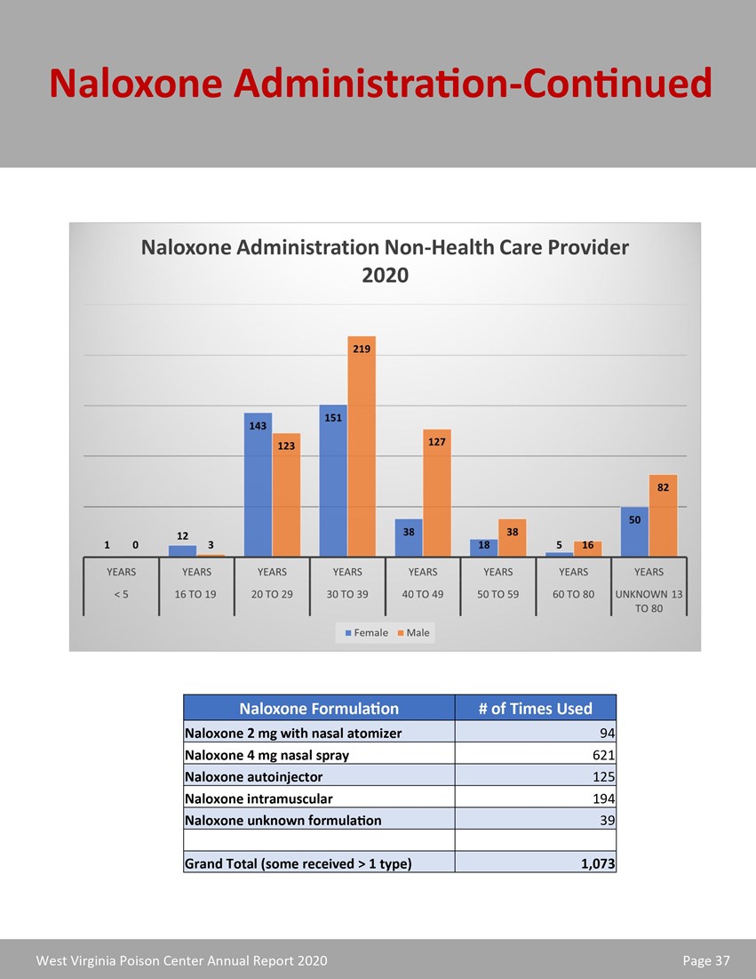 This image shows a bar chart from the 2020 West Virginia Poison Center Annual Report showing naloxone administration given to adults by non-healthcare providers. Most administrations occurred in adults ages 30-39, with higher numbers among males in most age groups. This image also has a data table showing naxolone formulations that were administered and the frequency of administration. Naxolone 4 mg nasal spray was the most commonly administered formulation, with a grand total of 1,073 administrations. If you'd like to receive this information, contact us.