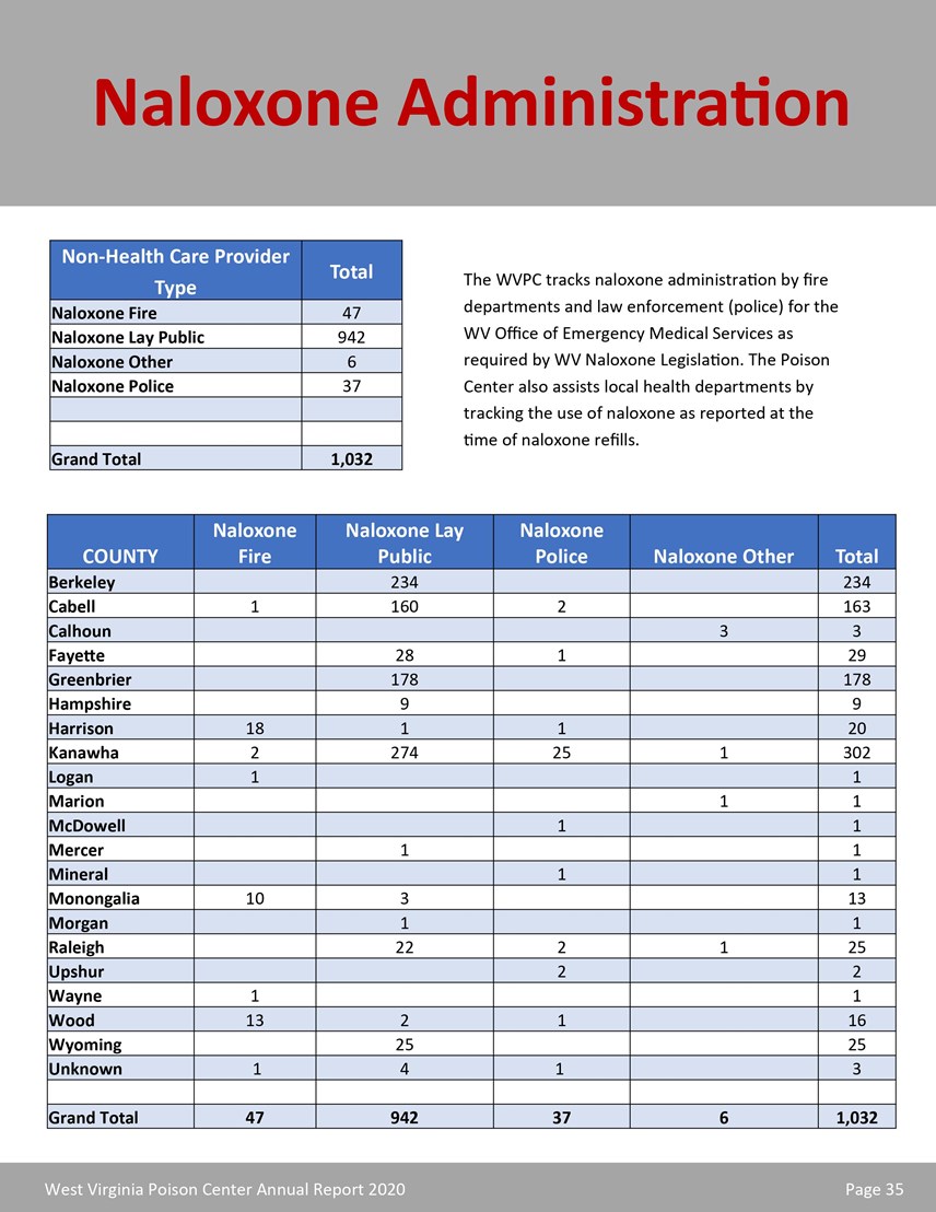 This images shows a data table from the West Virginia Poison Center Annual Report 2020 of naloxone administration by non-healthcare providers as required by WV Naloxone Legislation, totaling 1,032 cases statewide. The second data table in this image shows county-level data highlighting differences in naloxone administration by fire departments, lay public, police, and other non-healthcare providers across the state. If you'd like to receive this information, contact us.