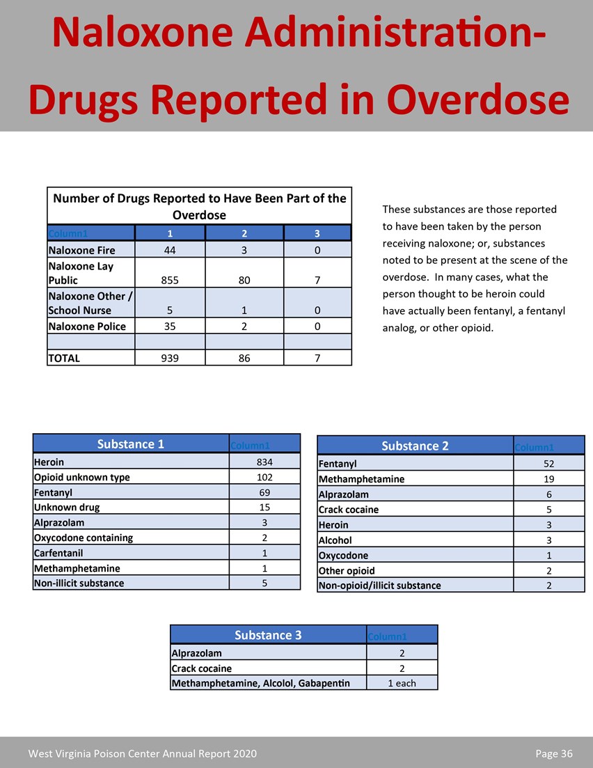 This image contains four data tables from the West Virginia Poison Center Annual Report in 2020 showing drugs reported in overdose. The first table shows the number of drugs identified in overdoses, as reported by fire departments, the general public, other non-healthcare providers, such as school nurses, and law enforcement. The remaining three tables provide information on substances reported in overdoses where naloxone was administered. The most commonly involved drugs include heroin, fentanyl, and other or unknown opioids. If you'd like to receive this information, contact us.