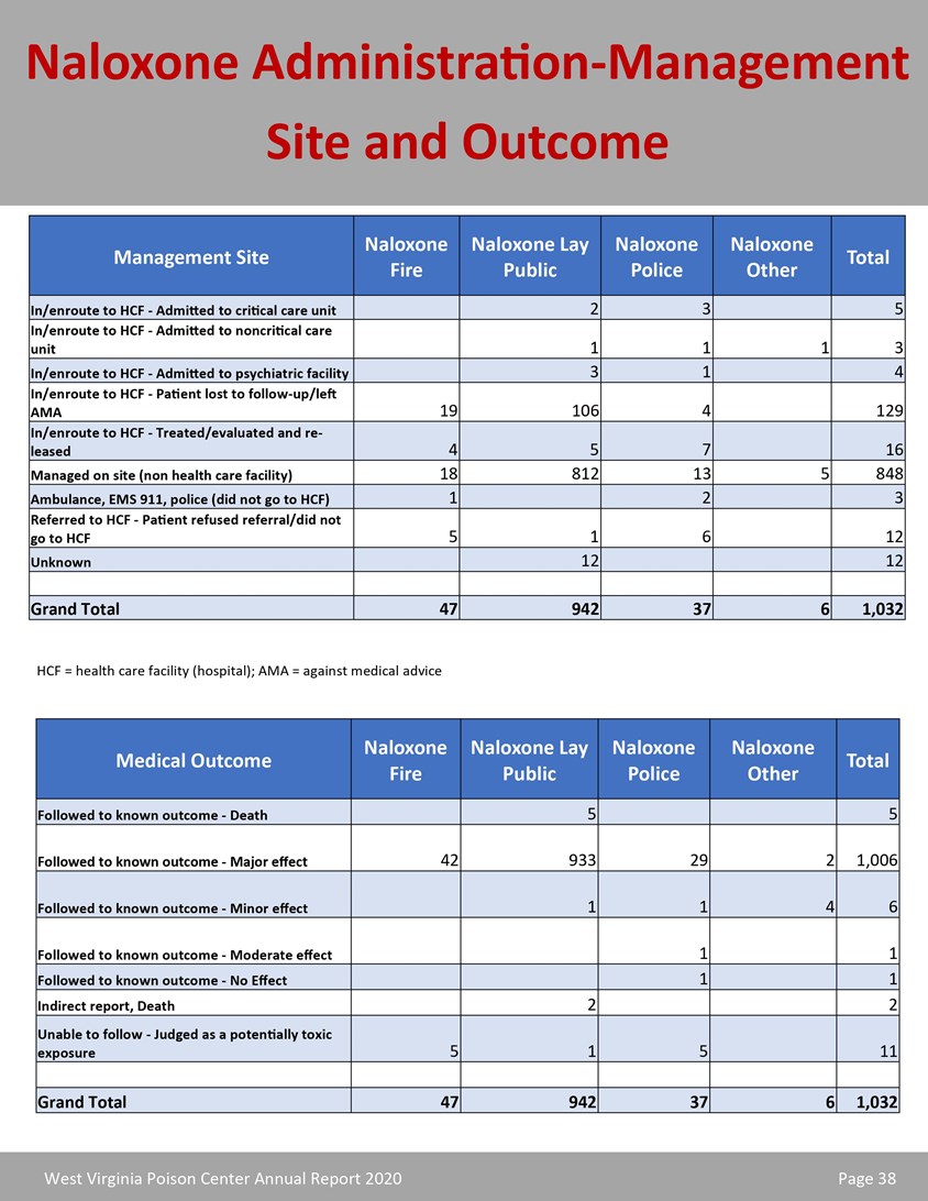 This image contains two data tables of naloxone administration from 2020 West Virginia Poison Center Annual Report. The first data table shows where naloxone was administered. Most cases were managed on site at non-healthcare facilities, administered primarily by members of the public. The second data table shows medical outcomes, with most patients being followed to a known outcome with a major effect. Total reported administrations were 1,032. If you'd like to receive this information, contact us.